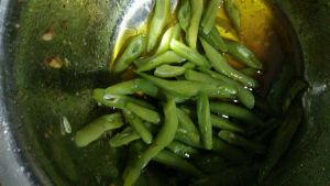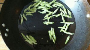 先炒冷菜,就有油了,再把四季豆倒下去,稍微炒一下