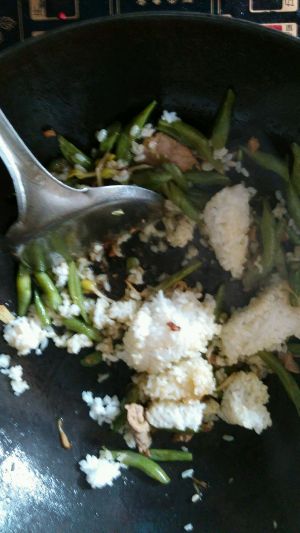 就可以把饭倒下去了,压扁、炒散