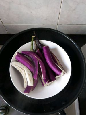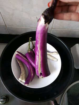 条茄洗净后分两段,用刀划开,摆盘放锅里蒸。茄蒂不要扔啦,好定型还保留营养