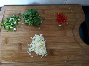 盖锅盖蒸茄子的时候做调料。大蒜切沫,小米椒切圈儿,怕辣也可以不放小米椒哦。香菜小葱都切小段儿备用。