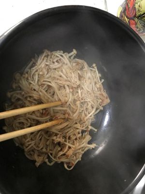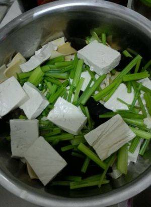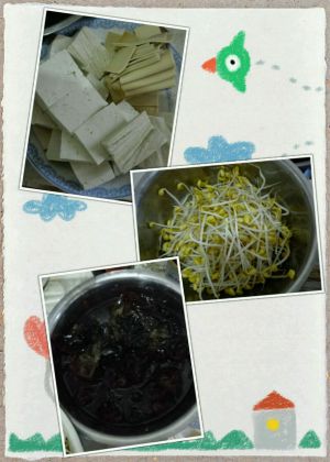 将配菜洗净切好,一般比较喜欢吃菜,会放豆芽,木耳,洋葱,豆腐豆腐皮,土豆片油麦菜等爱吃的菜嘿嘿,然后锅里烧开水放盐,将菜都抄熟