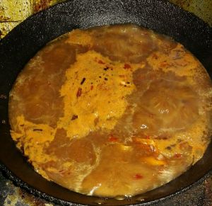 将底料倒入锅里加盐酱油糖高汤或清水煮沸。