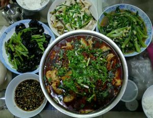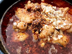 将煮好鱼片放入铺好菜的锅里,倒入汤料,鱼片上洒上辣酱面,麻椒,锅中烧热油,泼在辣椒面上