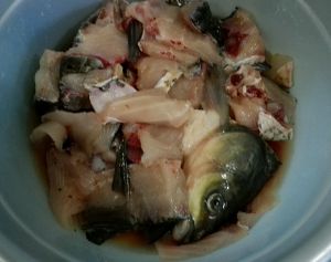 鱼肉切成片,鱼片用2克盐腌一会儿,鱼骨切成段