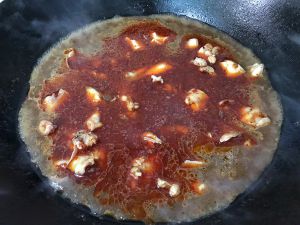 放入2勺豆瓣酱,继续翻炒,火要够大