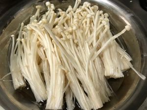 先下入金针菇焯熟放在一个大碗里,垫底。