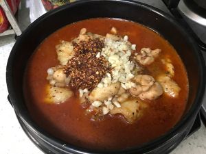 再将龙利鱼片逐片放入略煮,看鱼片全熟了即可,煮制时要不时的推动锅里的鱼蛙,不要粘底。