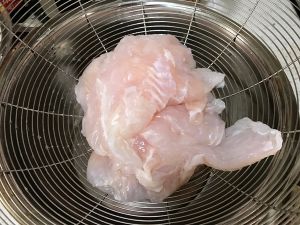 然后再放入鱼排,最后放入最嫩的鱼肉。要一块一块放,千万别一起倒入锅里哦。