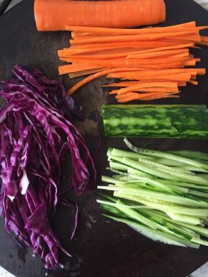 蔬菜洗净切丝,黄瓜可以不去皮,颜色会更绿一点~