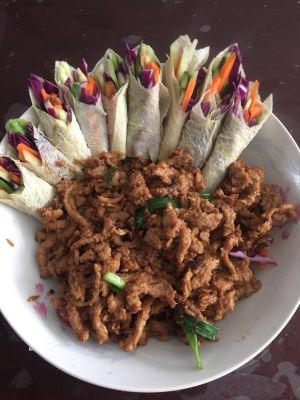 买的豆腐皮不太好,所以看起来不美观…我觉得可以试试薄薄的饼子包蔬菜试试…用豆腐皮包蔬菜然后中间斜切,两头切平,放入盘中就好~~