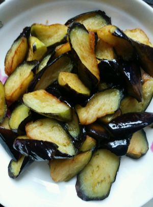 倒入炸好的茄子,加料酒生抽老抽翻炒一会儿,出锅前加一点儿白糖,不用加盐,因为味道已经很好了。