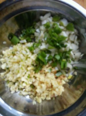 茄子洗净,切段,姜蒜肉切成小碎末,与肉末分开装