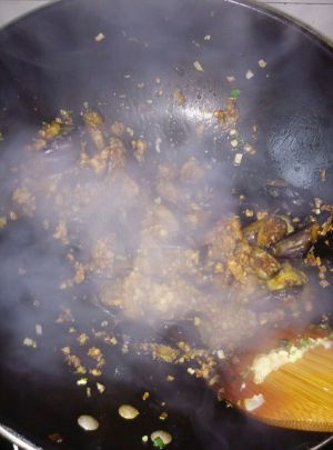 葱姜蒜爆锅,放入肉末至八分熟,将半熟茄子放入锅里翻炒