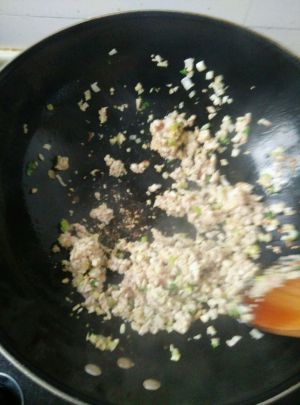 锅底留油,爆炒葱姜蒜后,倒入肉末翻炒至熟。
