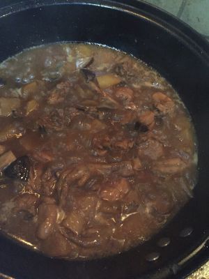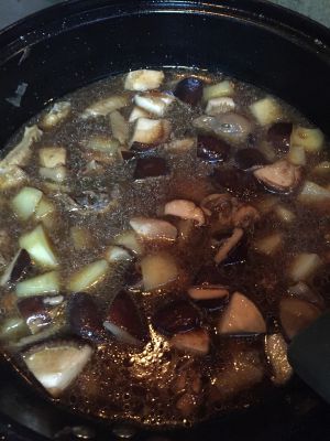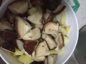 水开后加入过好油的土豆香菇,水刚好没过食材即可,不够的话就加些水