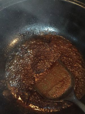 加入面酱炒出香味,不要炒糊,加入酱油,盐,糖,味精,少量水炒匀