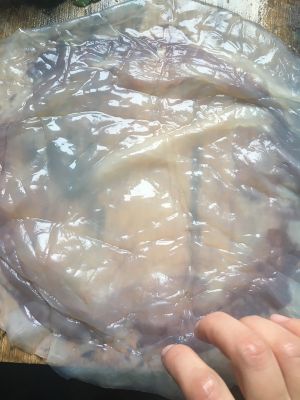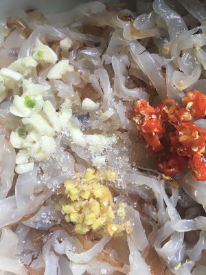 倒入适量白酒和盐在海蜇头上轻搓十分钟( 白酒既可杀菌,又可提升脆爽口感)。