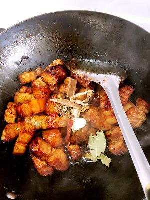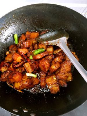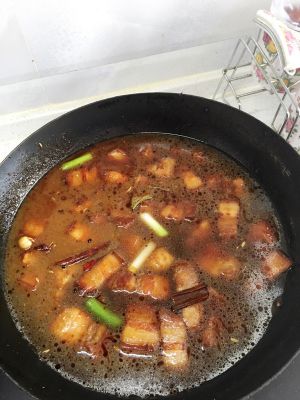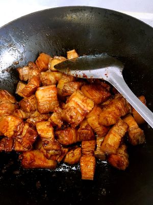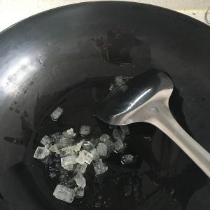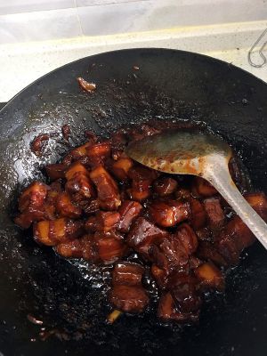 烧至酱油渗入肉中,汤汁干时,加适量水,大块的冰糖。