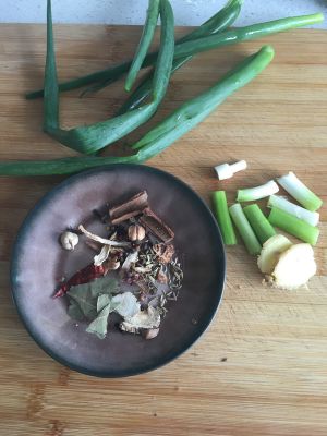 热锅,待油烧至八成热放入姜片,八角,桂皮炒香后再加入冰糖