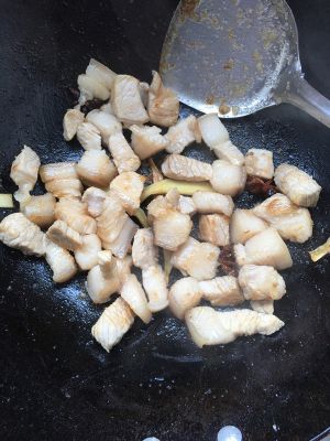 放入五花肉翻炒,把肥肉里的油尽量逼出来