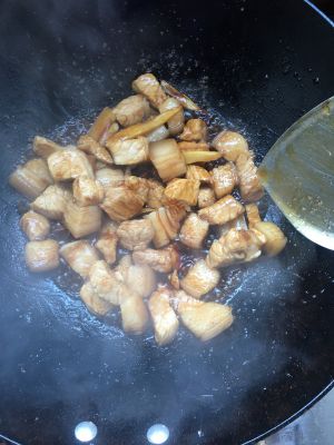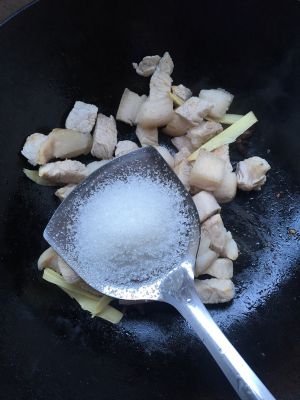 炒的过程要不停的翻,整块肉都有焦糖后就可以放盐了,看个人口味放多放少
