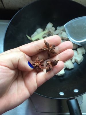 过完开水捞出炒干水份不用放油,加入八角和生姜翻炒