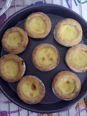 将塔皮摆在烤盘内。倒入蛋挞水,8分满即可。 我指定是倒少了。装入烤盘,放入约热好的烤箱中层。210度,25分钟左右,烤至蛋挞表面出现焦点即可。