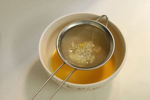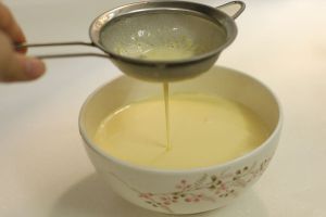 过滤好的蛋液加入微温的奶液,搅拌均匀后过滤2次,让蛋挞液尽可能的细腻