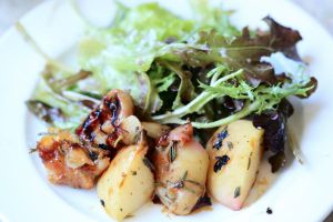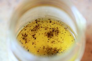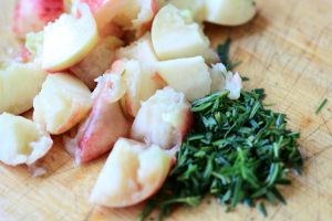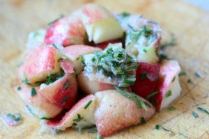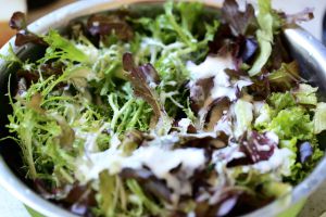 用一小盒酸奶、相当于酸奶三分之一量的橄榄油、盐和黑胡椒,充分混合成色拉汁。因为桃子烤完了特别甜,所以搭配的色拉就不能也是甜的。
