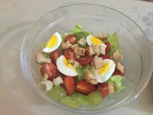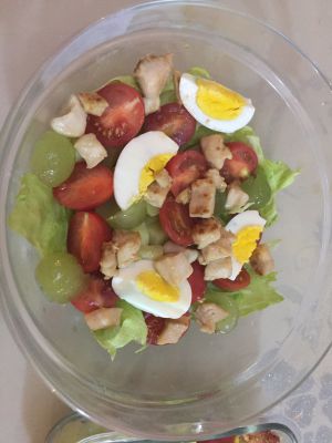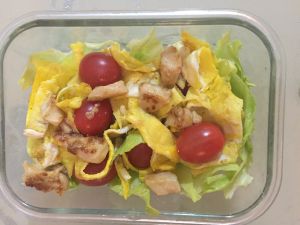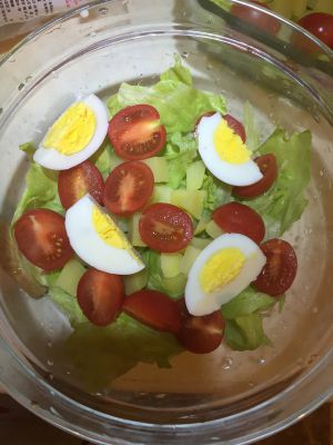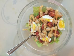 色拉菜和烘烤过的小面包丁,培根丁和一个温泉蛋或者色拉酱或者蛋黄酱拌匀。 撒上芝士碎。 放上鳕鱼条。