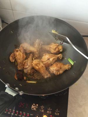 油加热,倒入洋葱爆锅,炒出香味,鸡腿下锅炒,加入姜片葱段和八角煸炒,倒入酱油在翻炒,加入可乐,沫过鸡腿就好,加入料酒去腥,加盖大火炖,再改小火,待肉酥软大火收汁