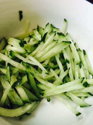 黄瓜切丝,加少许盐,腌制片刻,使其出水。