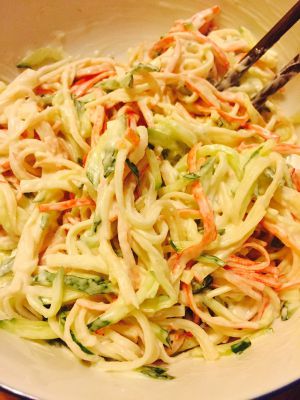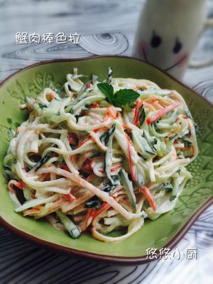 去掉黄瓜里的水,加入蟹肉棒,色拉酱,拌匀。