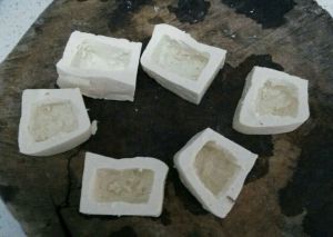 豆腐一块,改小,用汤匙将中间挖空,做成箱子状。
