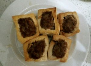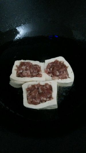 将肉馅填入豆腐箱子内,抹平。