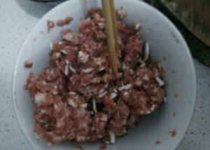 肉末,半朵香菇切碎,加盐、草果粉、酱油适量,一点点小粉,拌匀。