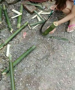 取新鲜竹子(径粗5-6厘米,竹节不小于30厘米)一段,当然也可以多段,看人数而定,下端留有竹节(竹节之下最好削尖便于插在地上),上端开口。