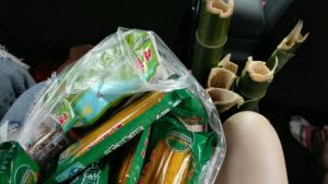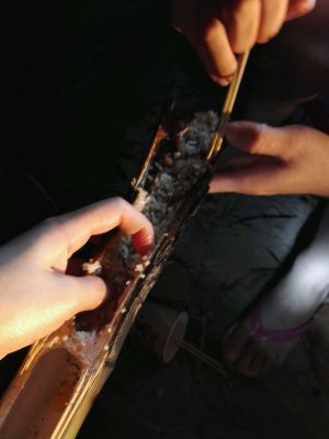 把腌制好的材料放入竹筒里面,对了,大家记得在材料上加食用油,因为我们第一次做的时候没放油,经过火烤的竹筒饭全部和竹筒粘在了一起