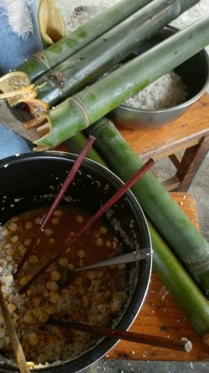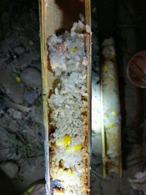 按食量加淘好的米在竹筒中(这是白饭,如加入鱼、肉、菜、盐、味精、油 等做成各色杂锦饭也行,依个人爱好和条件而定),加水(水量个人准节吧,咱们中国人天生就会做饭:))
