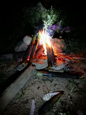 用铝薄、或菜叶、或竹叶塞住竹筒口后,吧竹筒围着火堆竖直或插或摆放, 注意不要倾倒,火烤约半个小时