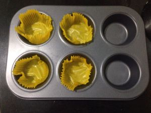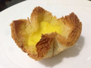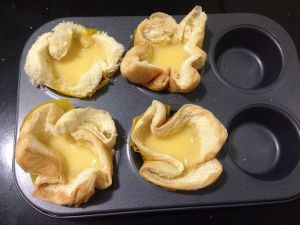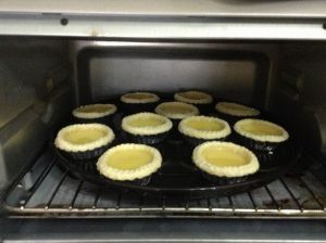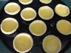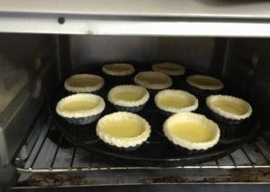 取出已冷藏好的蛋挞半成品,倒入蛋挞馅,八成满!