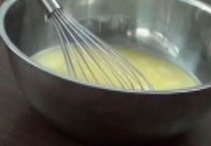 将鸡蛋和牛奶放入已冷却的糖水中用打蛋器打匀后过虑,蛋挞馅心完成待用!