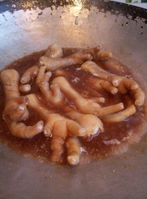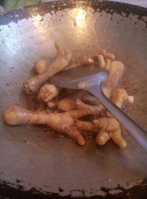 葱姜蒜辣椒爆香之后倒入鸡爪,放适量料酒,酱油,冰糖(两粒就可以了)