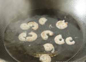生菜切丝,虾去虾线,锅内少油煎熟即可