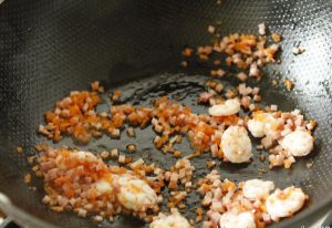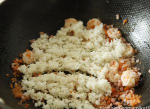将米饭和炒好的火腿、胡萝卜、熟虾仁混合。