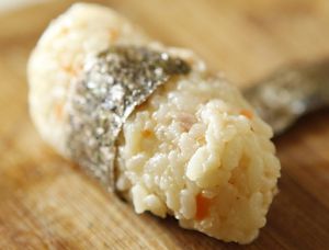 把扮好的米饭捏成三角形,贴上海苔。我的是用蛋糕模子压实,倒扣出来的,没法加海苔了。