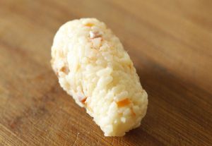 戴一次性手套沾上少许水将混合好的米饭用手捏成大小差不多的小饭团。