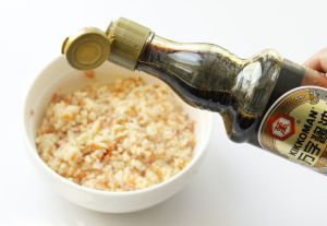 混合后的米饭放入容器,倒入万字酱油后,搅拌均匀。