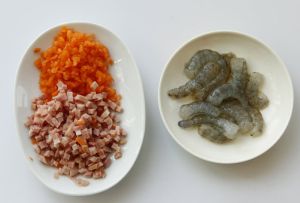 胡萝卜、火腿切碎粒,鲜虾去壳去虾线洗净。