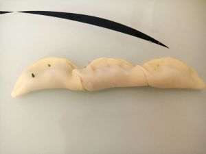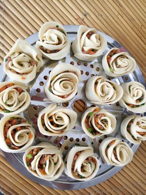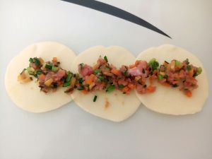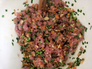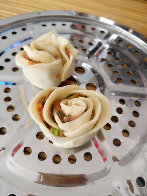 拌肉陷,后腿肉,肥瘦3:7的样子剁碎,我是在家乐福让师傅用机器打碎回来的,放葱花,生姜末少许,盐一勺,生抽两勺,老抽半勺,耗油一勺,蛋清一个,植物油四勺(油可以多点),顺时针搅拌。 开始包花,四个饺子重叠排开,放肉馅,少一点陷,不然会爆开。